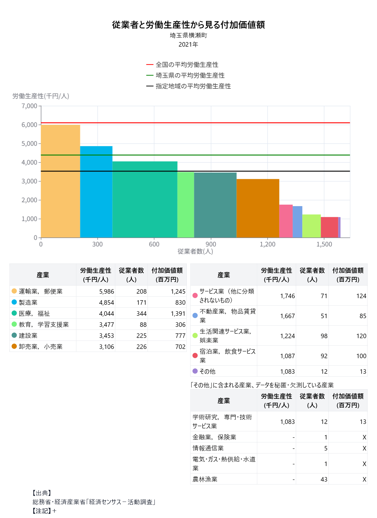 横瀬町の経済を付加価値額で見ると、「医療,福祉」「運輸業,郵便業」「製造業」が中心となっていますが、近年では新しいビジネスの誘致や起業支援にも力を入れています。特に、町の地域資源を活用した事業や、地域課題の解決に資する事業が期待されています。